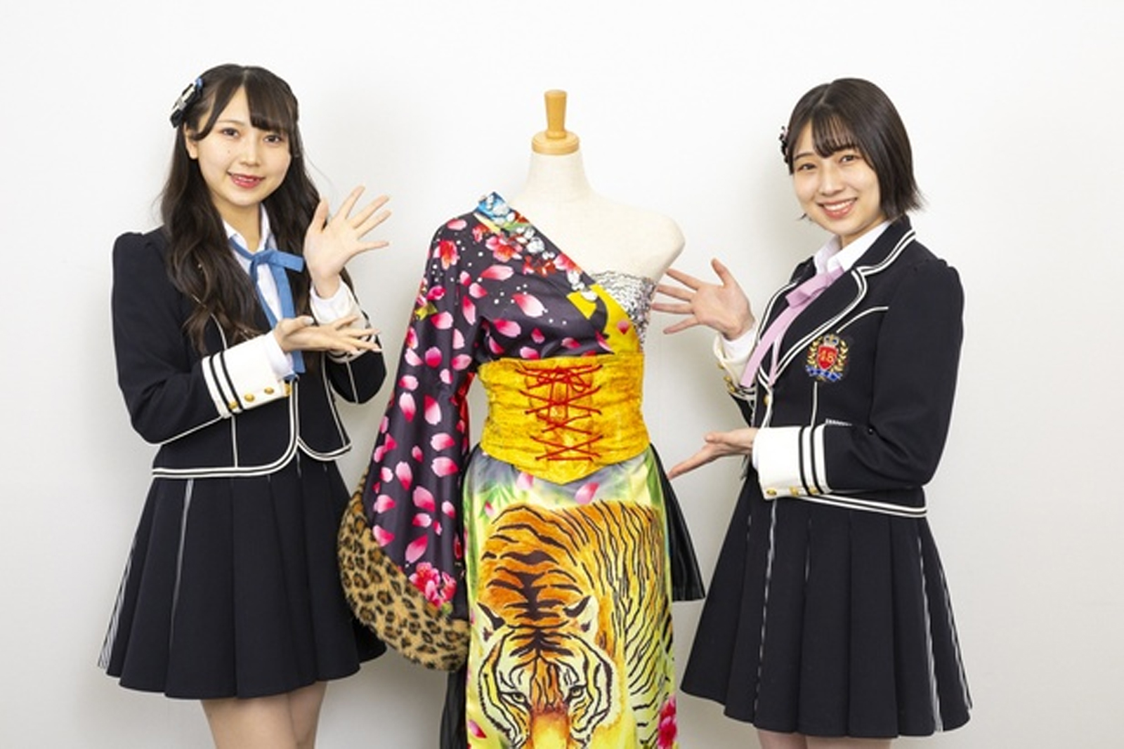 松永「うれしいー!この衣装は、下に着用しているトップスとスカート以外、帯も含めて生地はすべてオリジナルでプリントしています。和柄は日本の夜桜吹雪をイメージし、そして前面にプリントされた今にも襲いかかってきそうなリアルな虎は、“大阪魂=NMBメンバー”をイメージしました(笑)。裏地の赤い生地にも豹柄のプリントをして、細部までNMBっぽさを出しています。24時間生地屋さんに居座って(笑)、何回も何回もサンプルをプリントしていただき、徹底的にこだわりました。そして撮影日も迫ってきて『やっと生地が無事に揃った』と思ったら、発注してた豹柄のファーに手違いがあって、このファーより若干淡い色が届いちゃったんです。淡い色だとプリント生地のインパクトが弱くなってしまいバランスが悪いので、どうしてもこの色目(採用したファー)にしたくて、必死でかき集めました。そこで諦めていたら、全然見え方が違っていたと思います。そういう細かいところまで本当にこだわって作らせていただいた衣装です。この場をお借りして、協力してくださった生地屋さんをはじめ、当時製作に携わってくれたスタッフみんなにお礼を伝えたいです」