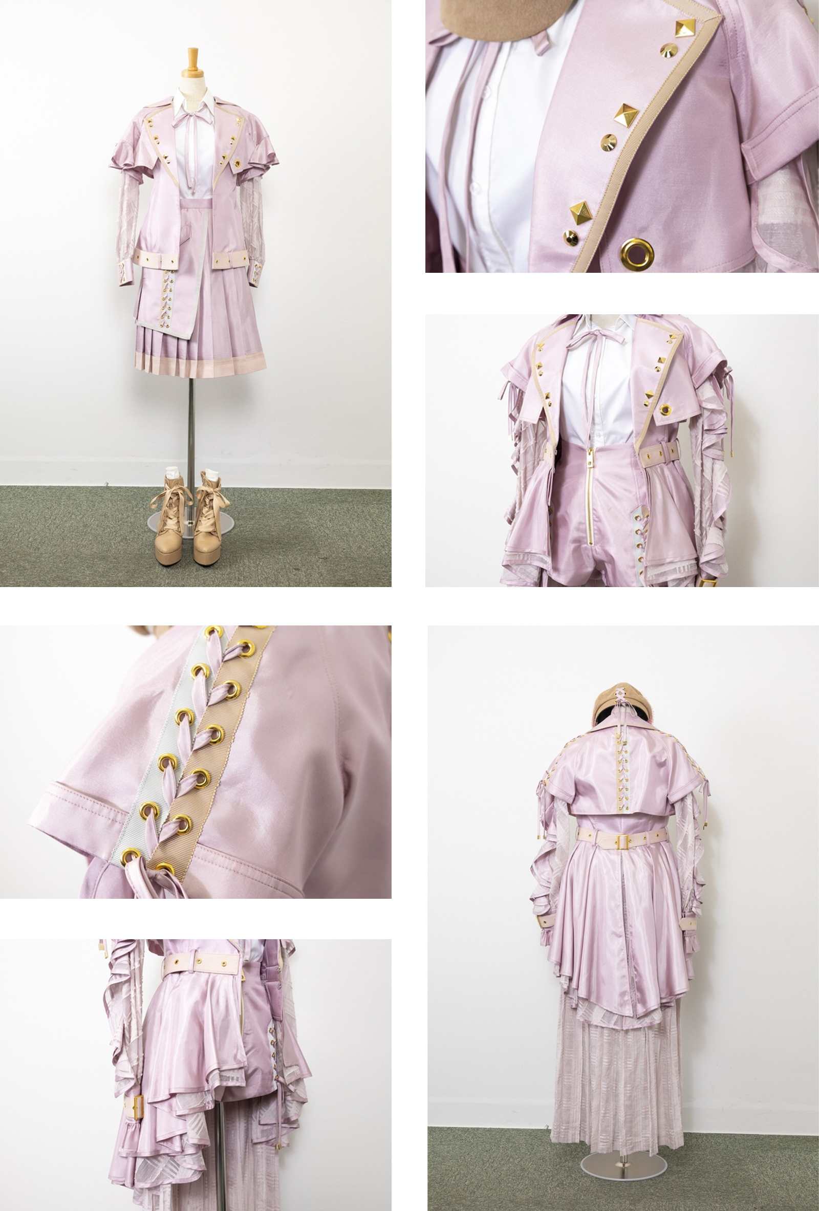 そこから作ったあかりちゃんの衣装は、フィッシュテールの裾に透け感のあるチェックの生地を組み合わせ、動いた時にウエストから下部分がふわっと揺れるのがポイントです。ロングコートだけど、曲調に合わせた軽やかな印象になるようなシルエットにしています。パイピング部分やレースアップのリボンなど、あらゆる箇所にこの生地を使用しています。あかりちゃんはどんなに忙しくても、いつも写真などで衣装のイメージとポイントをしっかり伝えてくれて、あとは全てこちらに任せてくれます。長年信頼してくれて、いつも本当に尊敬と感謝です!(笑)」