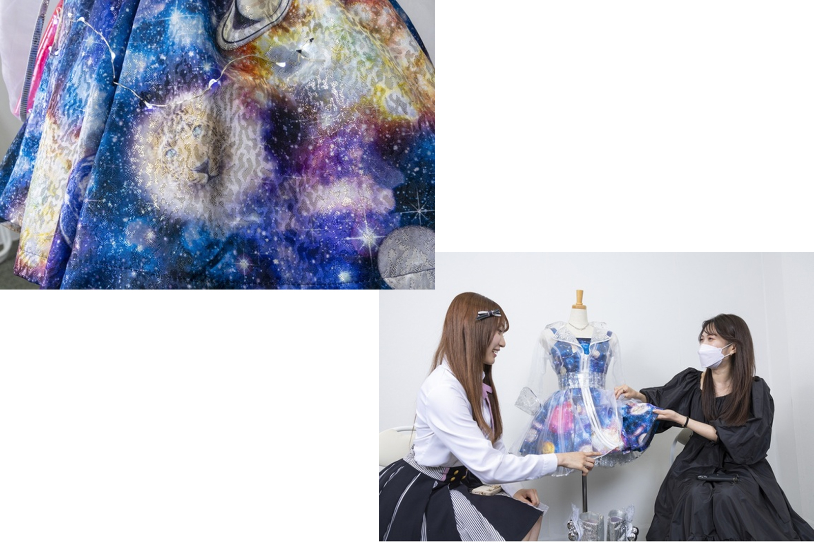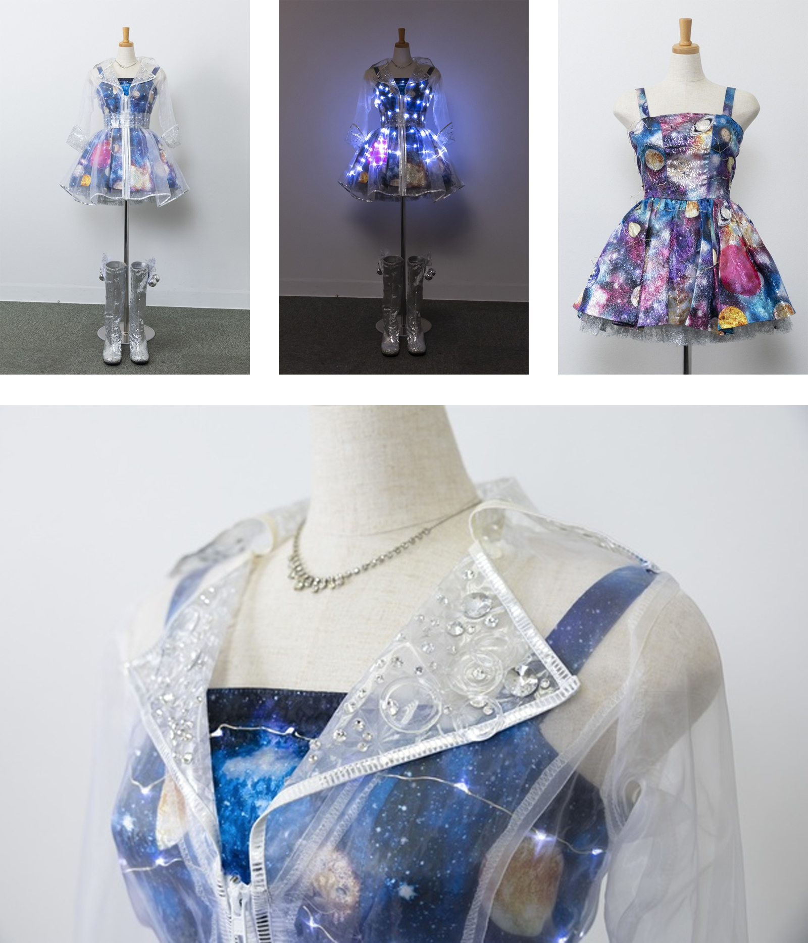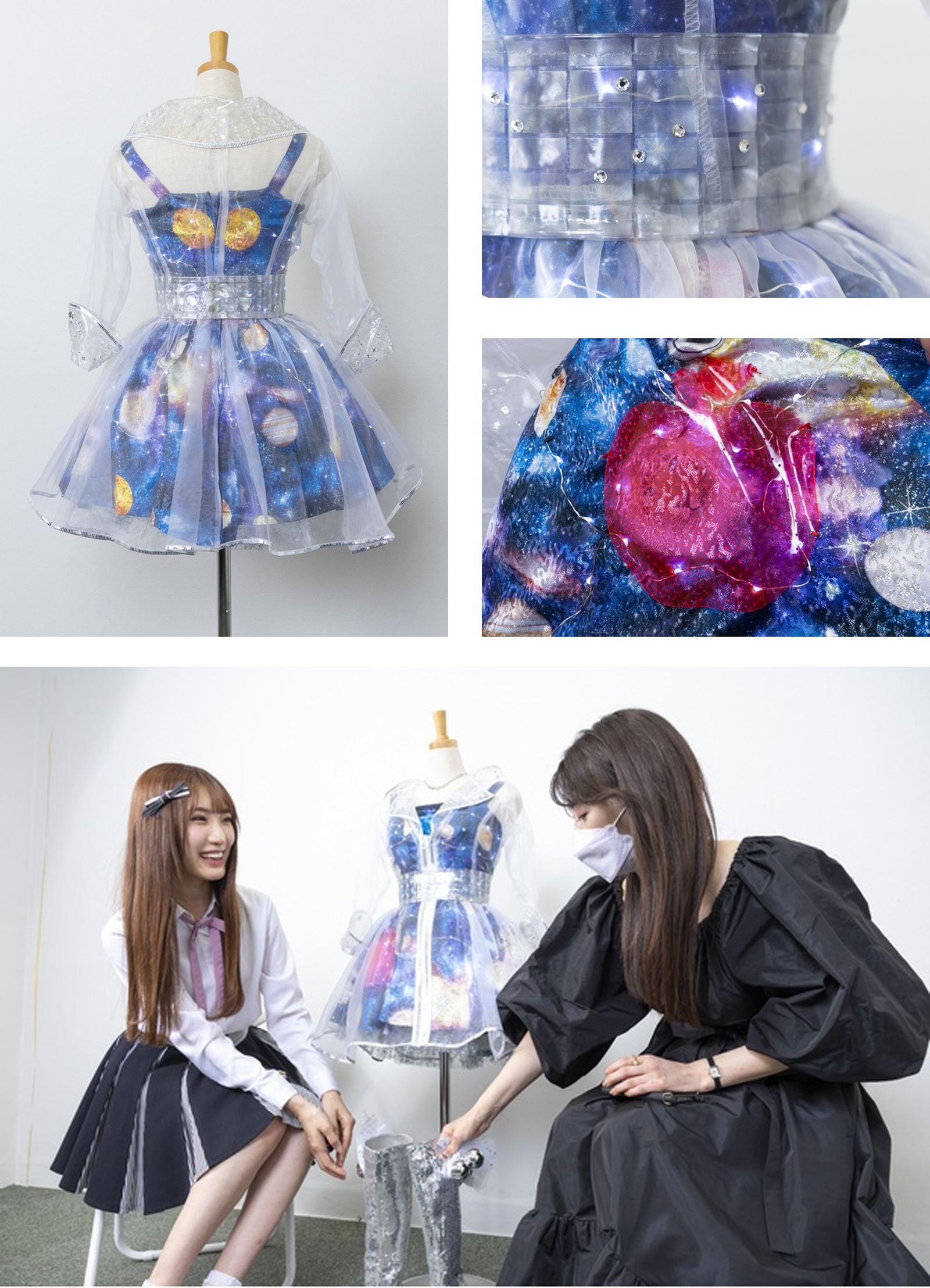 松永「この衣装を作るとき、最初、“宇宙”っていう2文字だけをテーマにいただいて、そこから想像していきました。宇宙には壮大な力があり、人には無限の可能性があることを衣装でも表現したくて、メンバー1人ひとりが“小宇宙”になるような世界観をイメージして作らせていただきました。そして16人揃ってパフォーマンスしたときに満点の星になるように、360度電飾を施しました。このベースのワンピースはよく見るとラメ入りの豹柄の生地で、その上にオリジナルで宇宙柄のプリントをしています。実はヒョウの顔の惑星もいるんですよ(笑)」