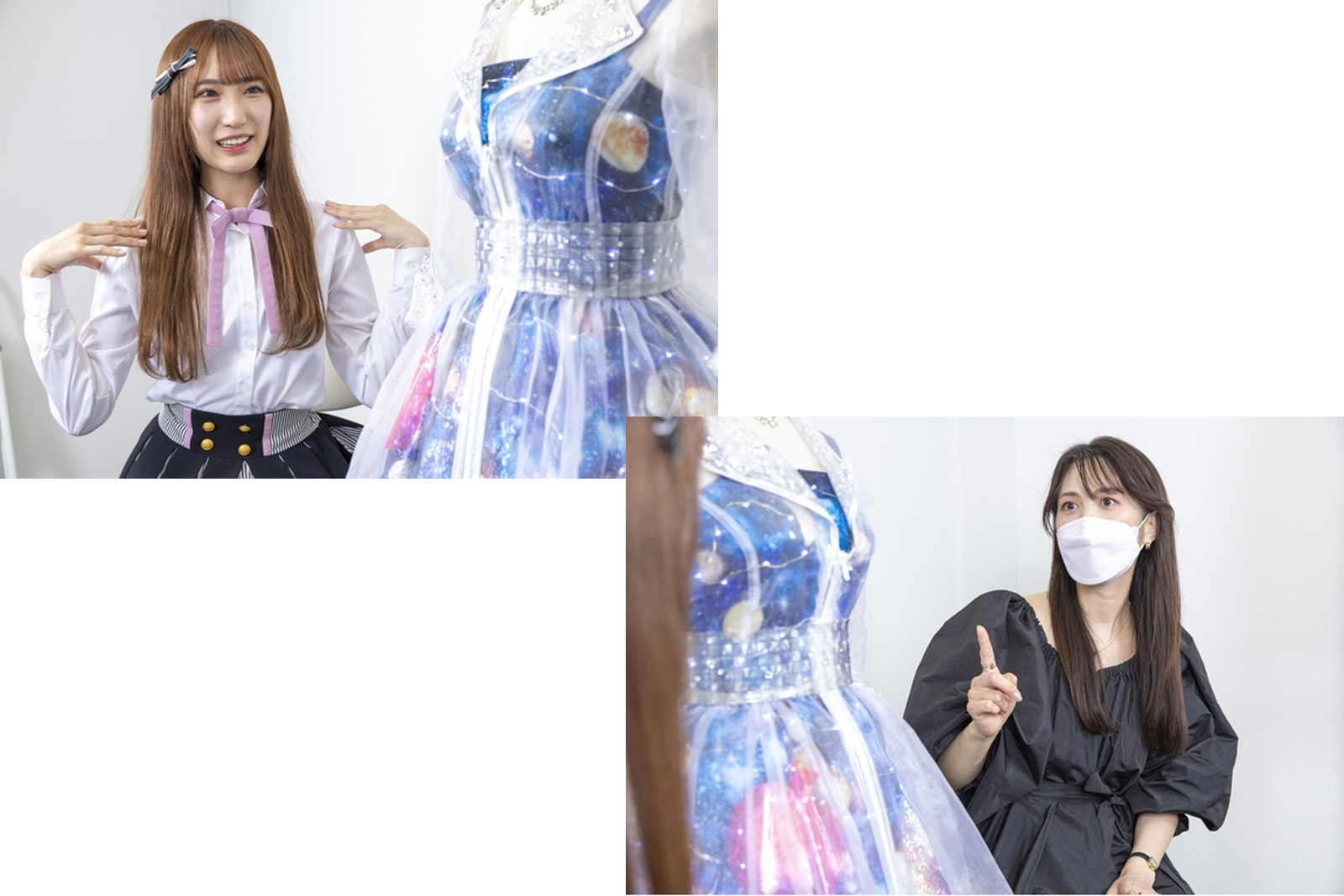 「原「このお衣装は、オフィシャル撮影のときに一度着ただけなんです。ライブでも着させていただけることが少ないので、私たちにとってもレアな衣装ですね!久しぶりに近くで見られました。天文学部が出てくるMVとお衣装がすごくマッチしていますよね」