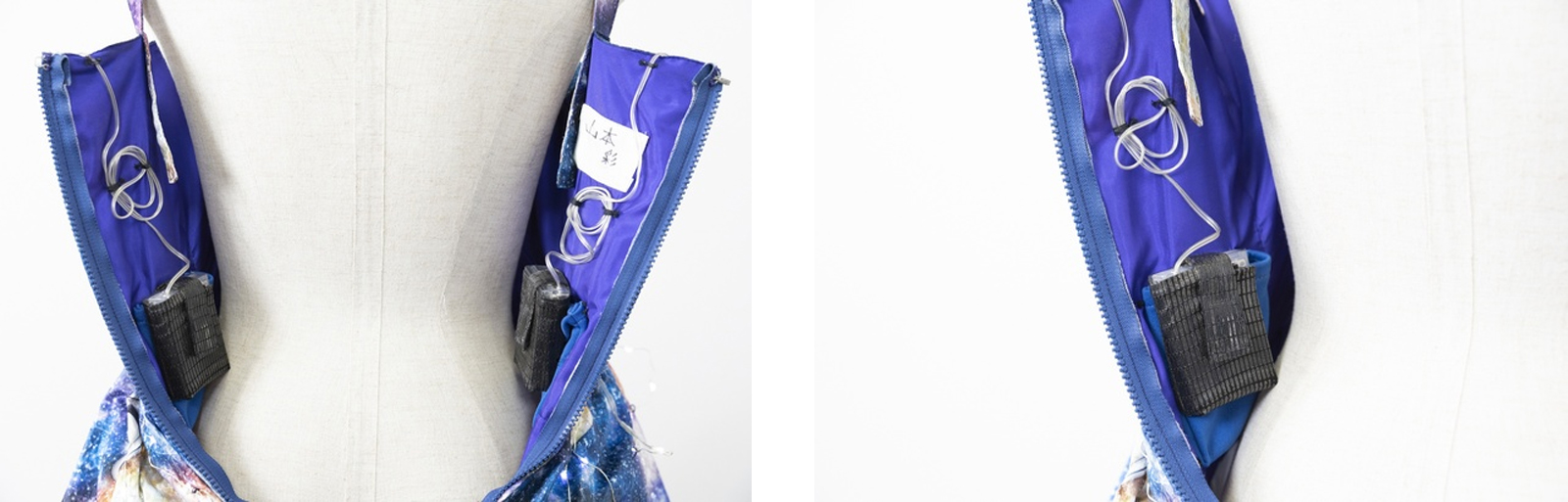 松永「その電飾ワンピースの上から、この光がよりきれいに反射するように、すごく薄い生地だけれど光沢や透明感のあるしっかりとしたグラスオーガンジー生地のコートを着るデザインにしました。この生地もいろいろと探しましたね。この生地のコートがあるのとないのでは、全然見え方が違うんです。ベルト部分の生地も、光をきれいに通すようにPVCであえて少し柄入りのものにし、光が透けてさらに輝くような生地を選びました」