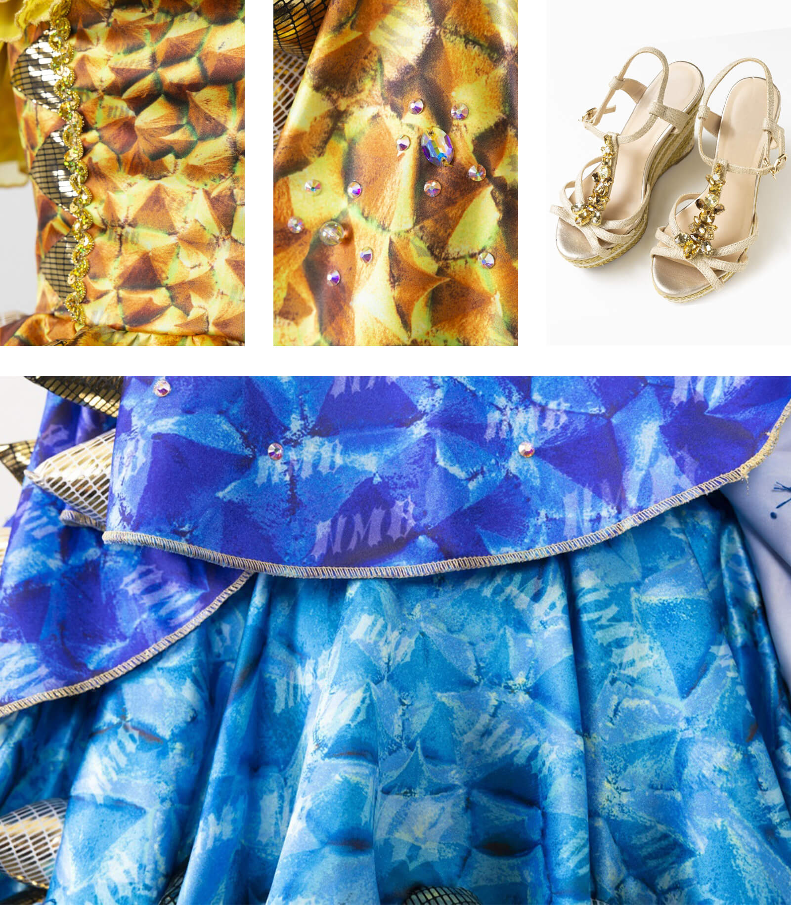 リアル柄以外はブルー、ピンク、オレンジ、イエロー、グリーンの5色展開で、楽曲のイメージに合わせて賑やかな雰囲気を目指してカラフルにしました。メンバーの個性によって振り分け、さやかちゃん(山本彩)はブルー、みるきー(渡辺美優紀)はピンクが基調ですね。頭飾りは花冠だったりカチューシャだったりで全員違いますが、すべてドリアン入りです。このモチーフも1つずつ手付けしました。フロントメンバーは最後の振りに合わせてリングも着けています」