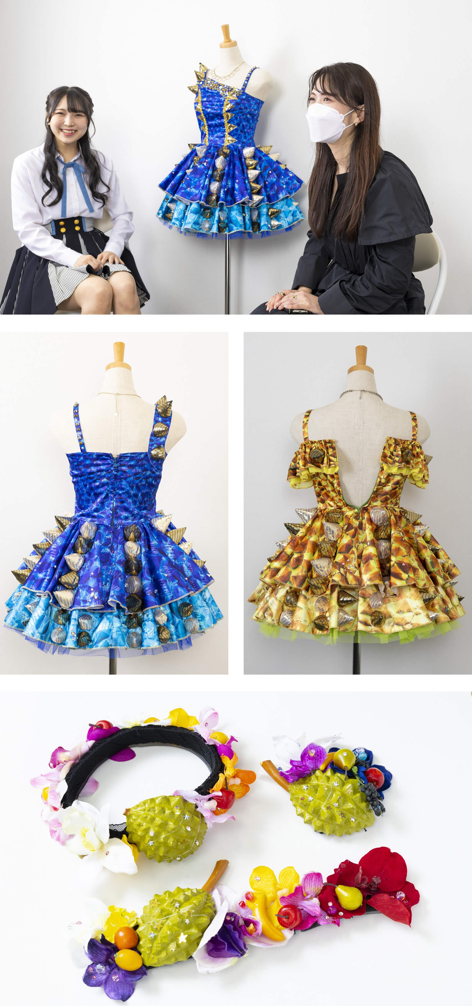 「ベースの生地には本物のドリアンをそのままプリントしています。なかでもセンターの衣装だけはリアルなドリアンを意識して色めもリアルな色で製作し、頭にも1番大きいドリアンをかぶってもらいました(笑)。手首飾りは、最後の振りで右手を顔の前に持ってくる振りがあるので、ドリアンモチーフが見えるように右手に付けています」