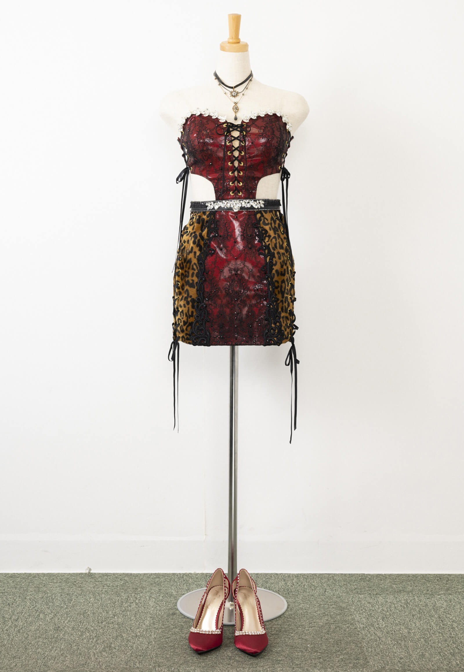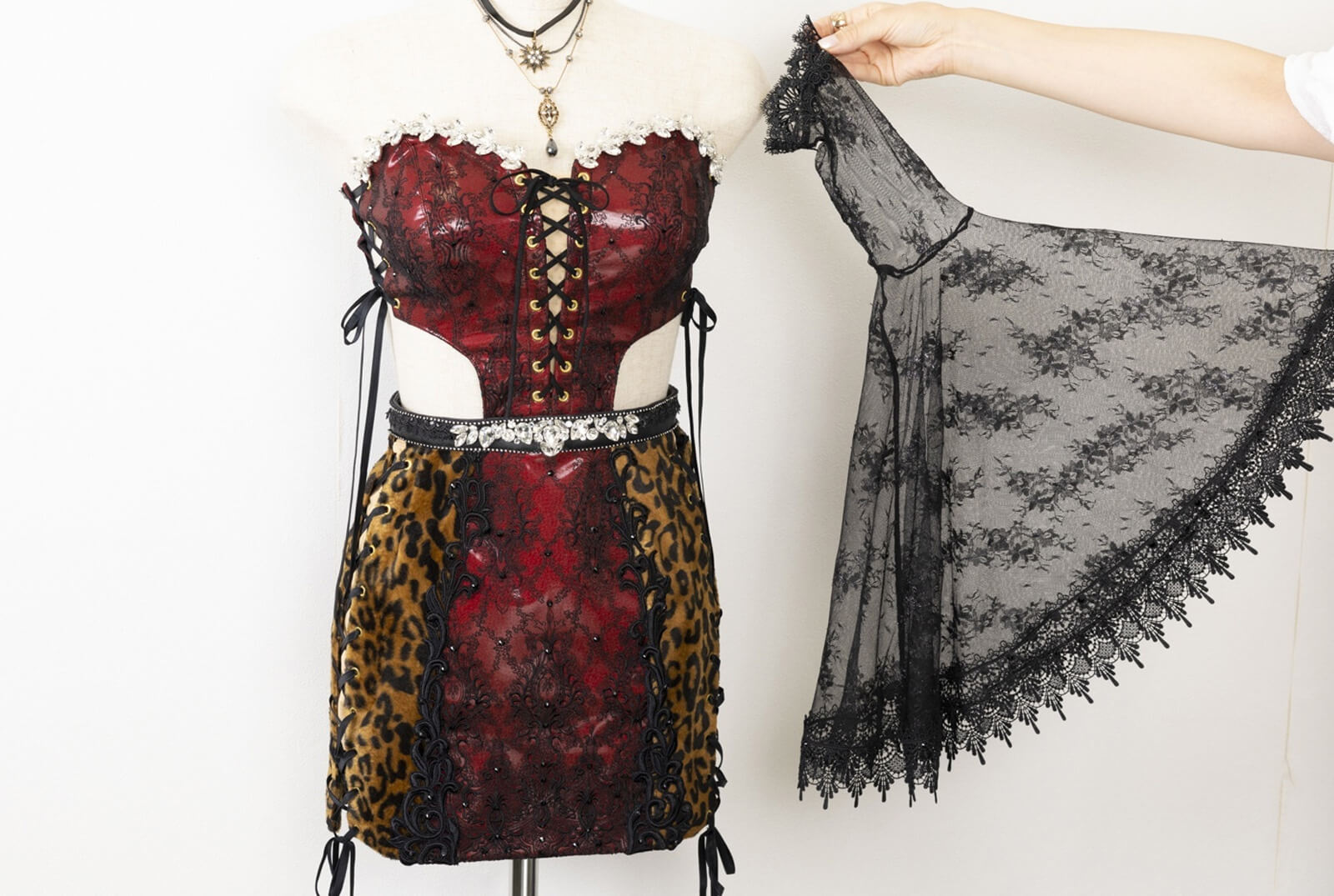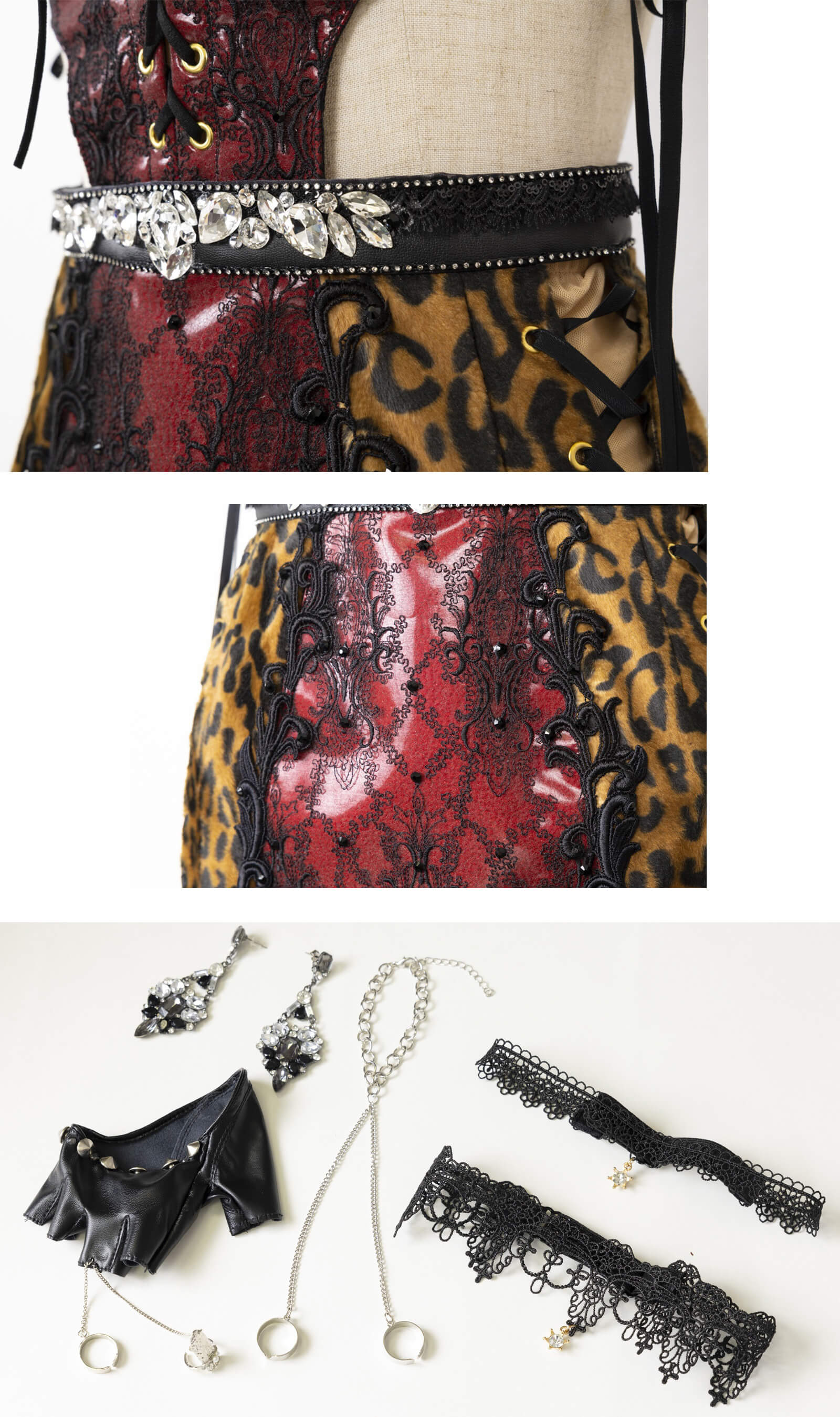 「ベルト部分のビジューや赤生地の上の黒レースに装飾している黒いストーンなどは、全部手付けです。さらにブレードを叩いて繊細かつ豪華に。彼女は大胆な装飾も似合うけど、繊細で上品なレースも似合う。しかも脚が細くて長いから、ガーターベルトが2本あっても余裕で着けられるんですよ。あの脚の長さには『どういうこと?』っていつも驚かされます(笑)。アクセサリー類は振付後に用意したんですが、指先の振付がとても印象的で素敵だったので、指も細くて長いこじりんならではのチェーン付きのリングを両手に!気になるボトムスのレースアップの“肌”の部分ですが、もちろんアンダーインナーを着用して、こじりんの肌になじむベージュの生地を重ねています。レースアップ部分以外はオリジナルプリントでヒョウ柄に。また、谷間のV部分にも同様のベージュ生地を重ねています」