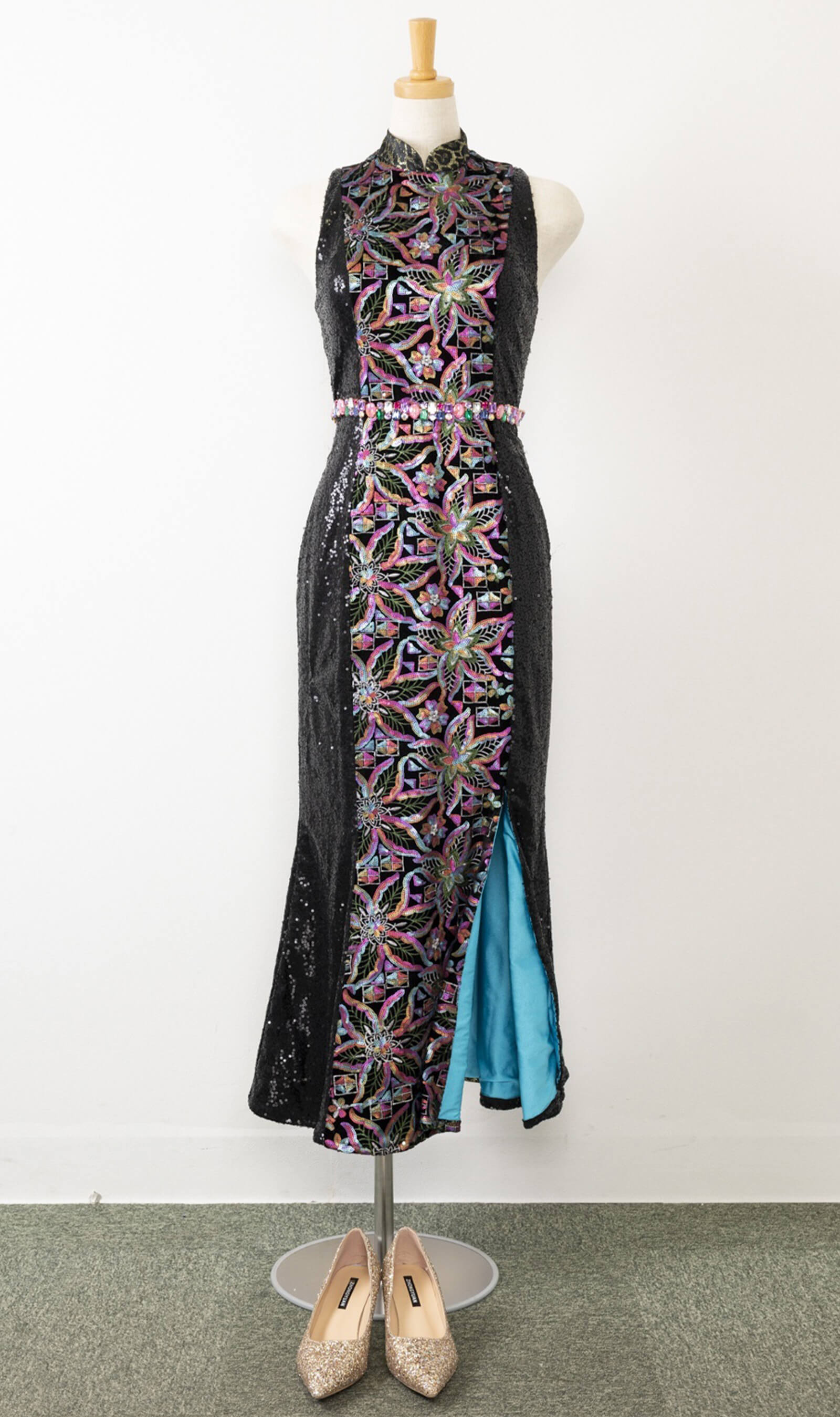 松永「曲を初めて聴いたとき、ミラーボールがまわっていそうな昭和歌謡で、シュープリームス(The Supremes)さんの衣装イメージ(スレンダーラインでスパンなどの光沢のある素材のロングドレス)が浮かんで、なぎちゃんにも聞いたら、テレサ・テンさんの『愛人』のイメージをもらいました。私のイメージとなぎちゃんが言ってくれた衣装が似ていて、画像を見せて『こんな感じだよね?』『そうです〜』って一致して、このデザインが生まれました」