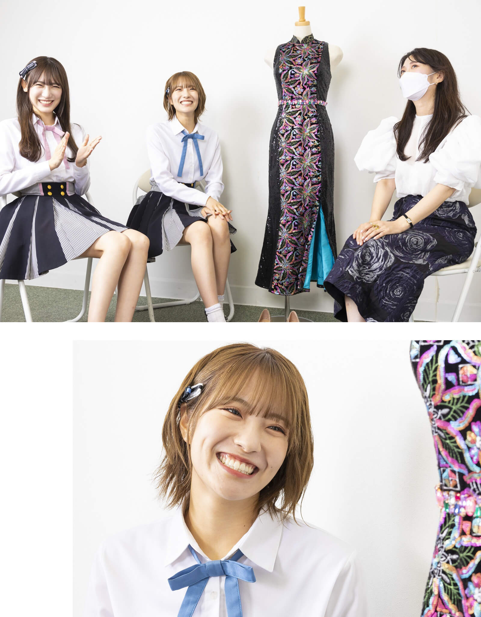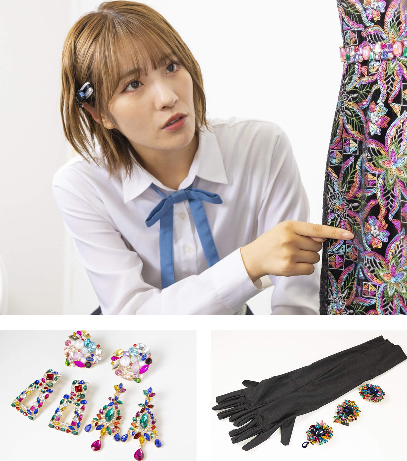 小嶋「コンサートのカメコタイムでファンの方に撮っていただいた写真を見たら、衣装もきれいに撮っていただけていて。その中で『あの衣装はどうなっているんだ!?』っていう意見もありました(笑)。ビジューや胸元の装飾もいいアクセントになっていて、アクセサリーも全部すごくかわいい!」