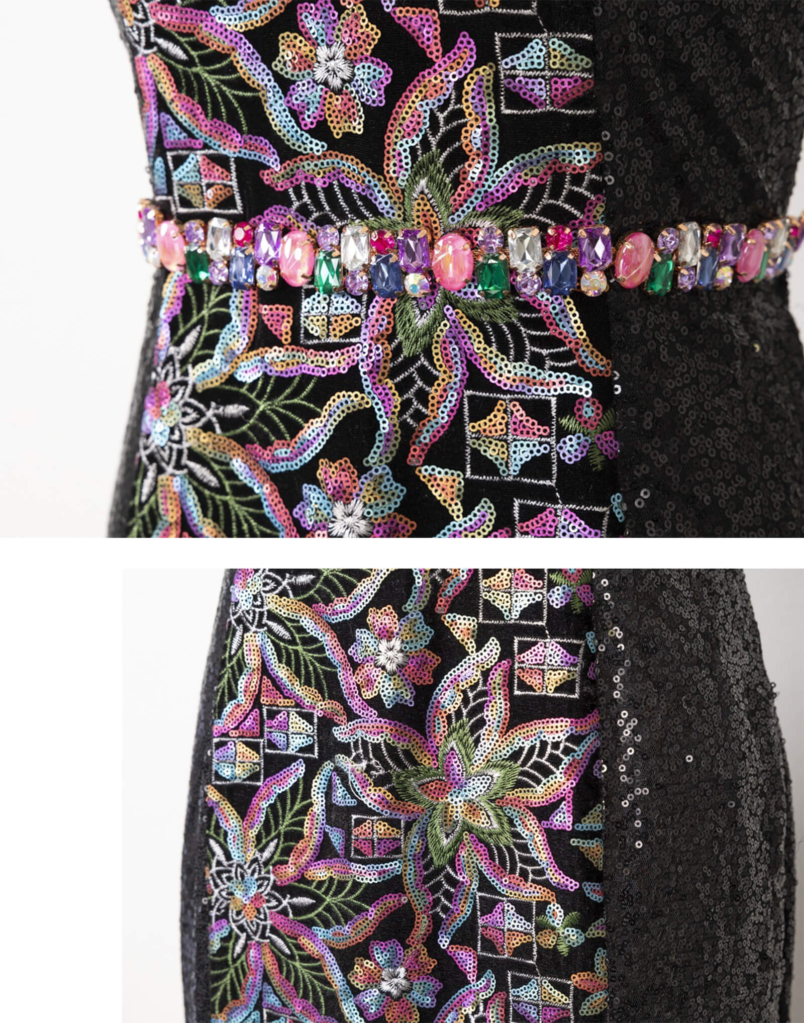 「歌唱メンバーである、昭和歌謡が大好きななぎちゃん(渋谷凪咲)と話し合いながら作っていきました。道頓堀のネオンをイメージしていて、スカートの色も11人分バラバラです。普通の立ち姿でも中の色が見えるようにスリット部分は縫い付けて、総スパンとビジューでさらにネオンらしくしました」