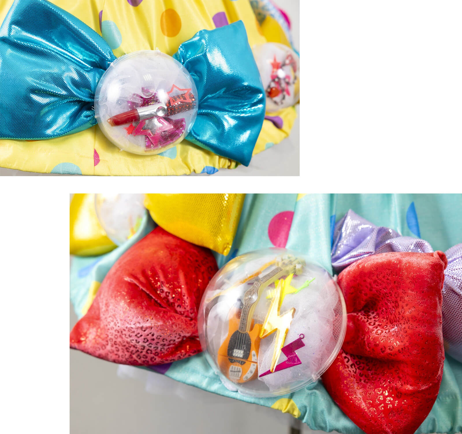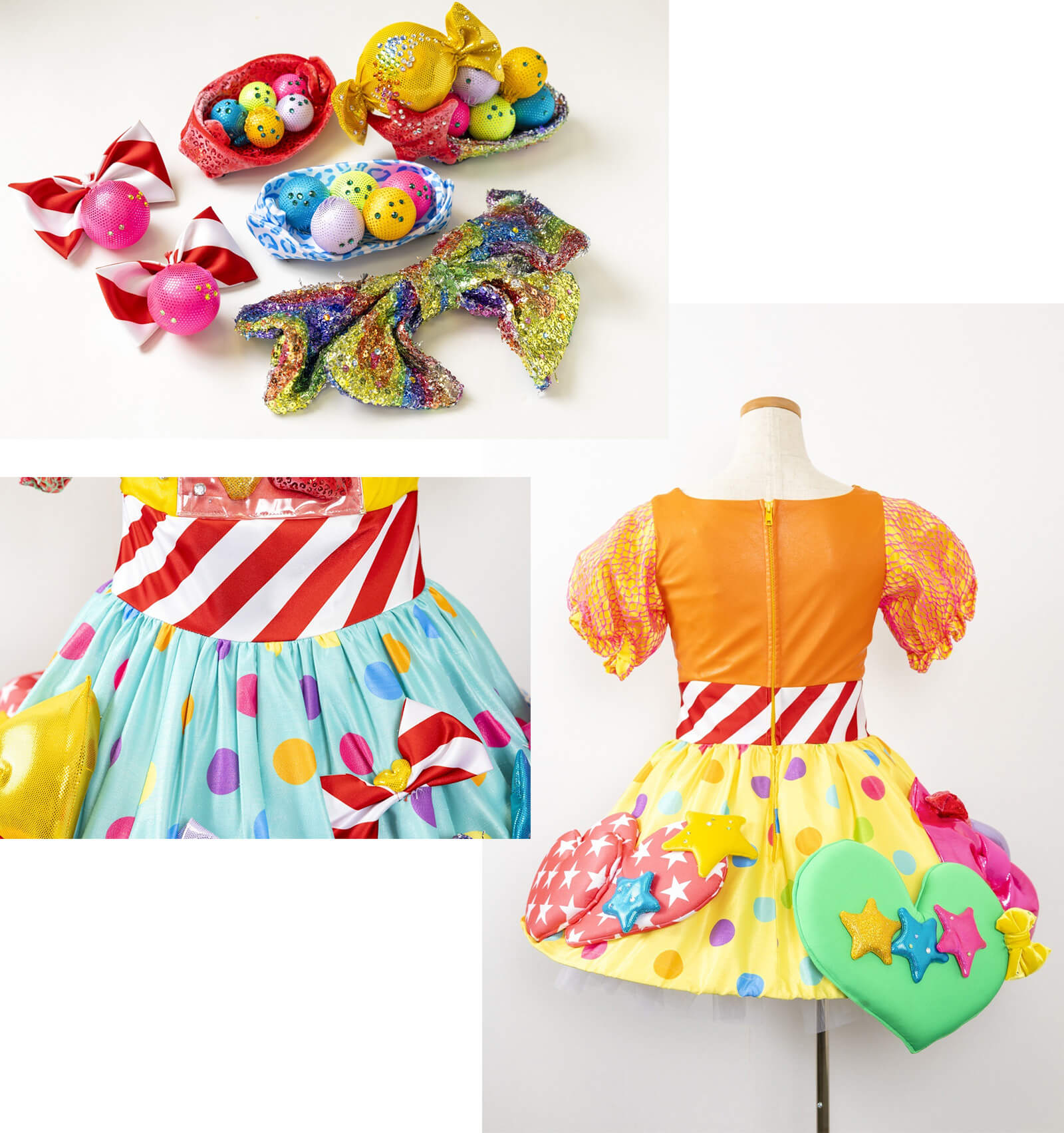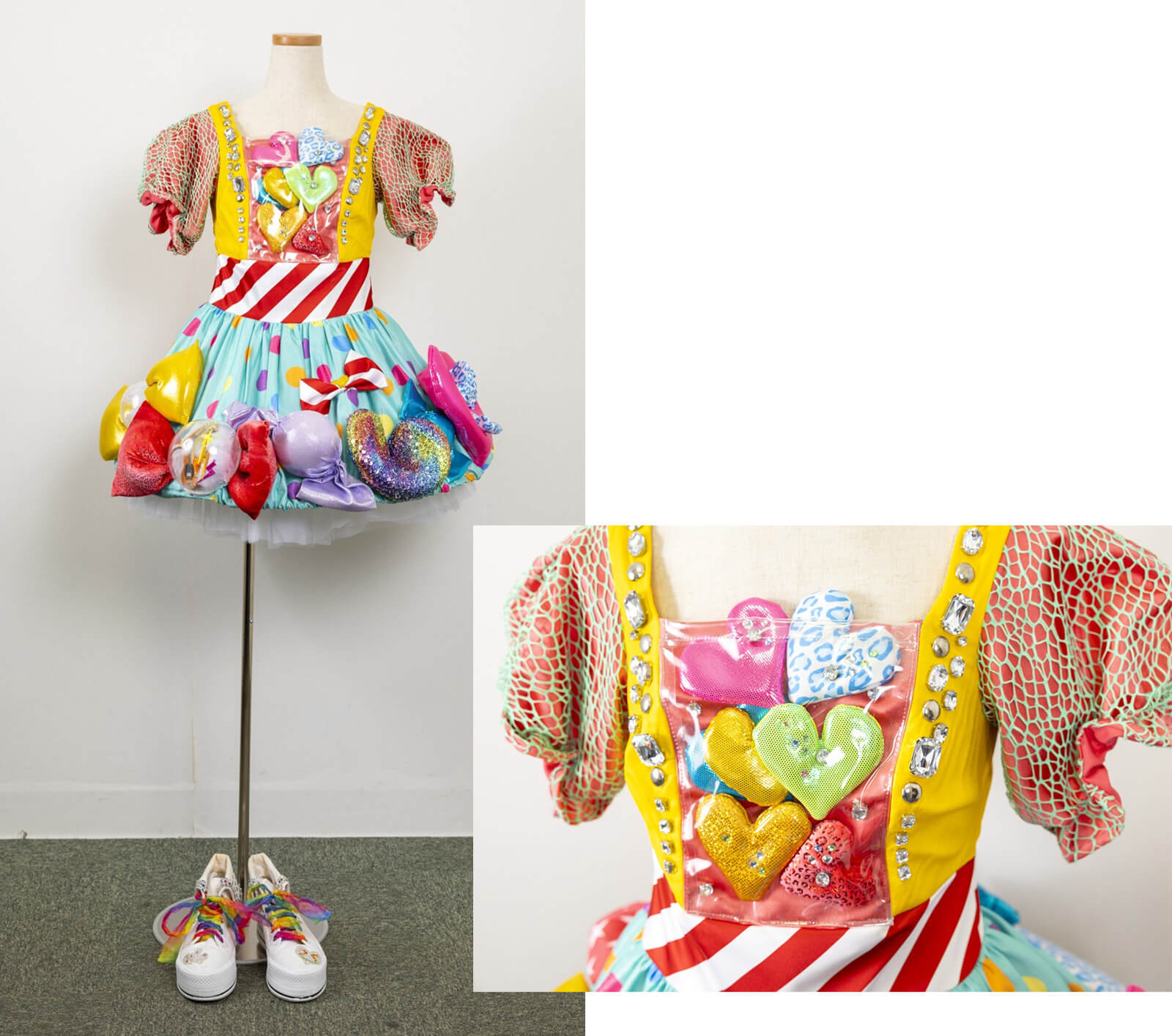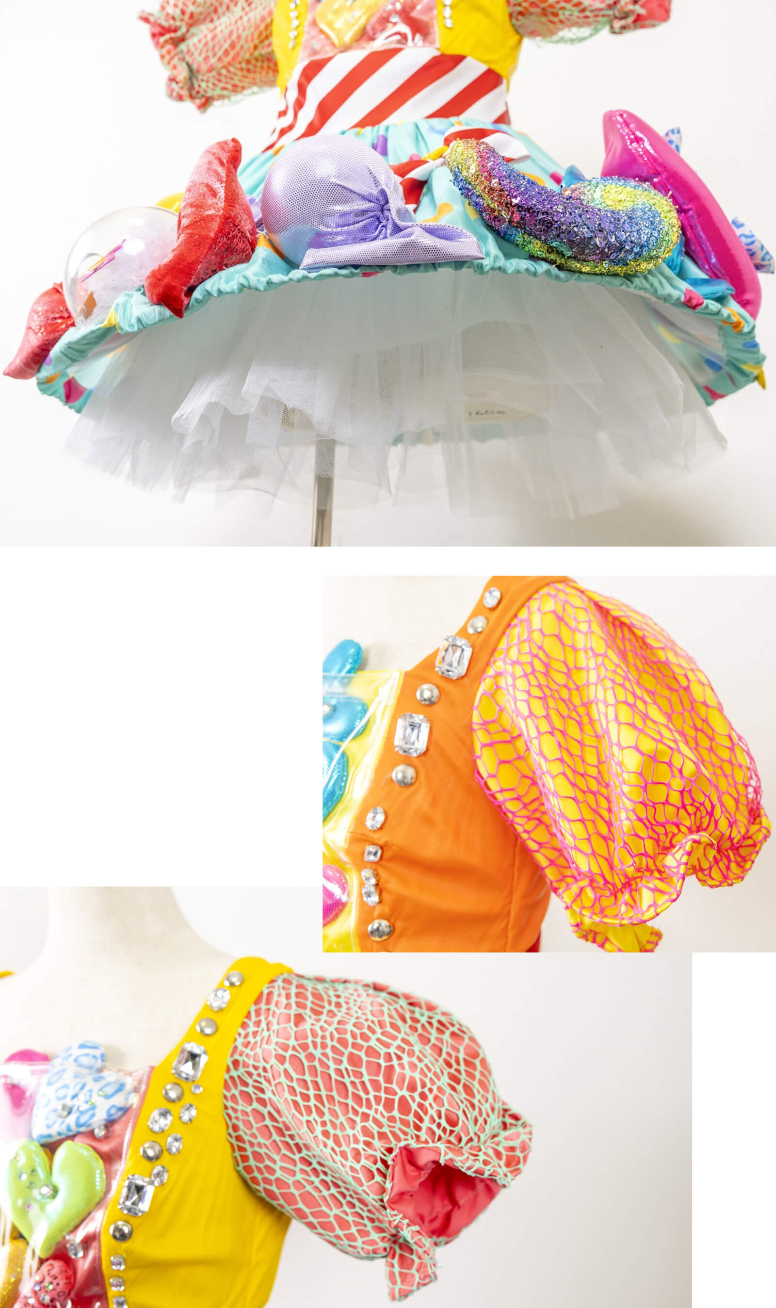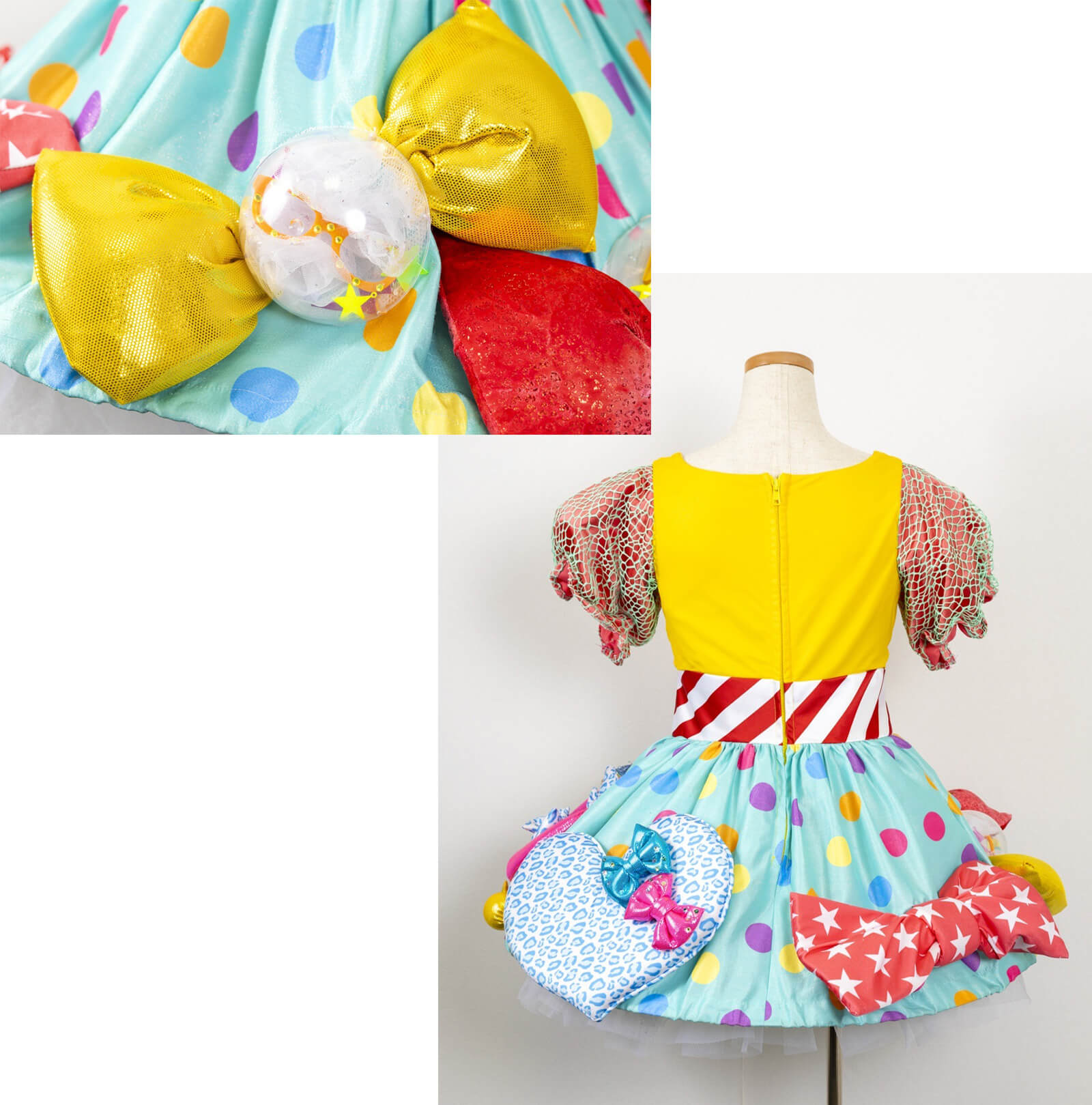 「ポップな大阪らしさ全開の衣装にしたくて、『くいだおれ太郎』をイメージしました。ベルト部分やスカート、装飾モチーフ部分などバランスを見ながらオリジナルプリントし、色は2色展開。どちらも色の組み合わせを試行錯誤しました。この衣装が、歴代で一番色の数が多いと思います。スカートはモチーフやカプセルの重さに耐えられるよう、裾にワイヤーを入れ、スカートの内側にはハードチュールを重ねています。ワイヤーを入れないと装飾の重みに耐えられないんですよ。このままハンガーにかけるとかさばるので、持ち上げて収納しています(笑)。胸元のクリア素材の部分は、踊って汗をかくと曇ってしまうので、穴の数を増やしたりしました」