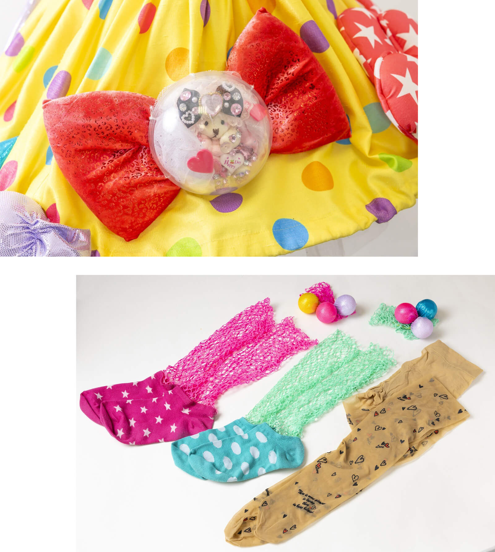 さらに、カラフルな網ソックスに星や水玉柄の靴下、柄入りストッキングまで、細かな部分もパンチが効いている。「柄入りストッキングは踊ると破れやすいので、大量に手配しました。足元には衣装に負けないよう、厚底の白スニーカーにレインボーカラーのリボンや装飾を施し、さらに網ソックスでボリュームのバランスを見てスタイリングしました」
