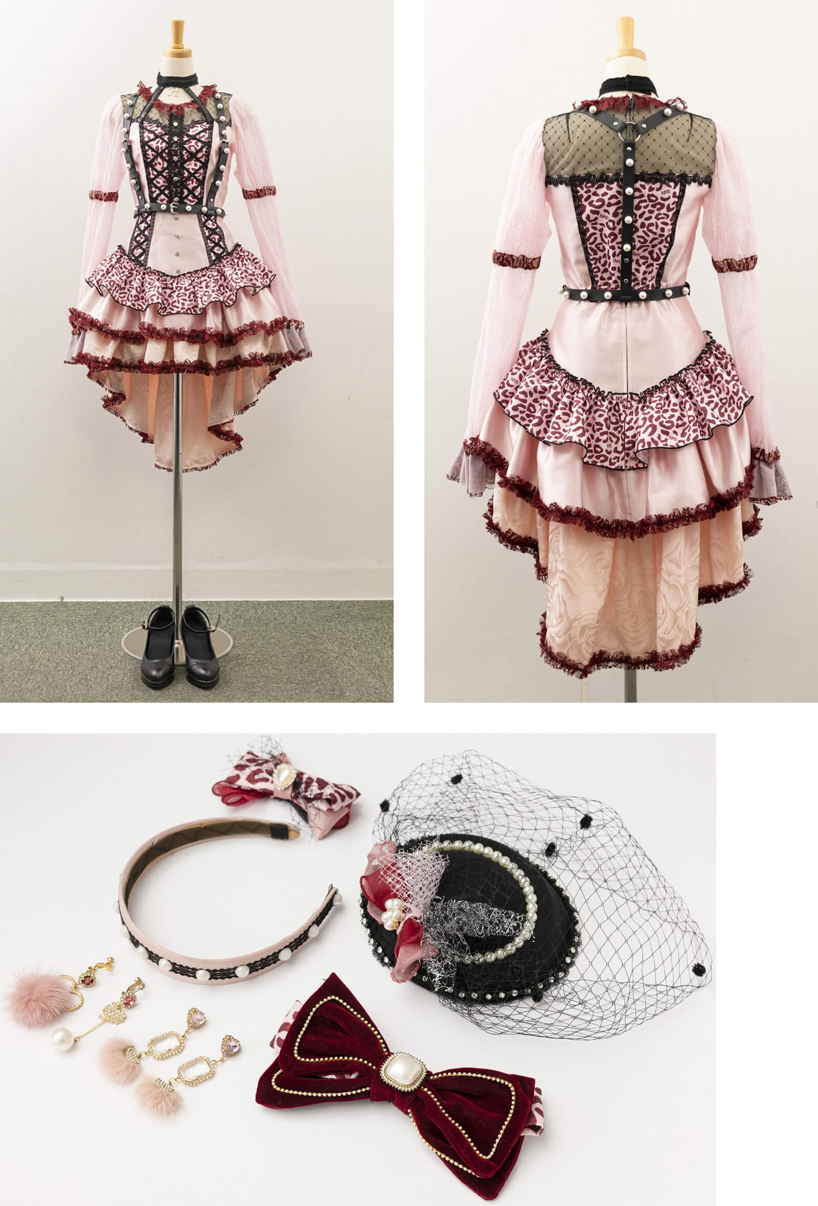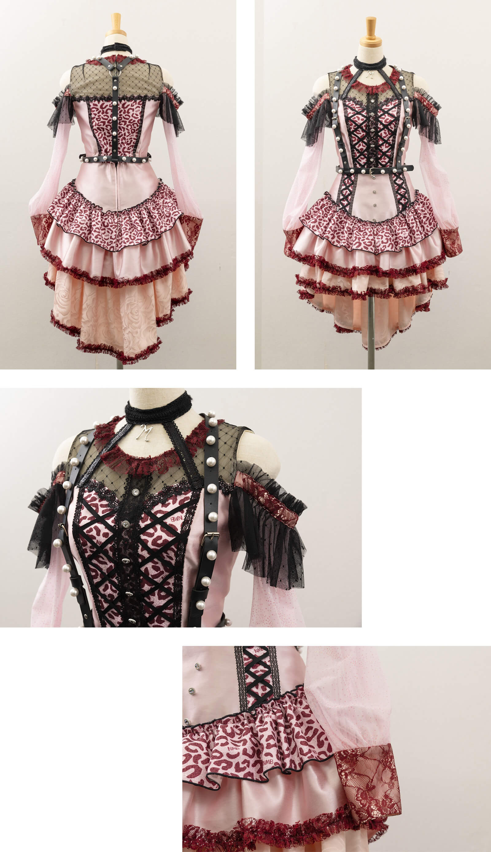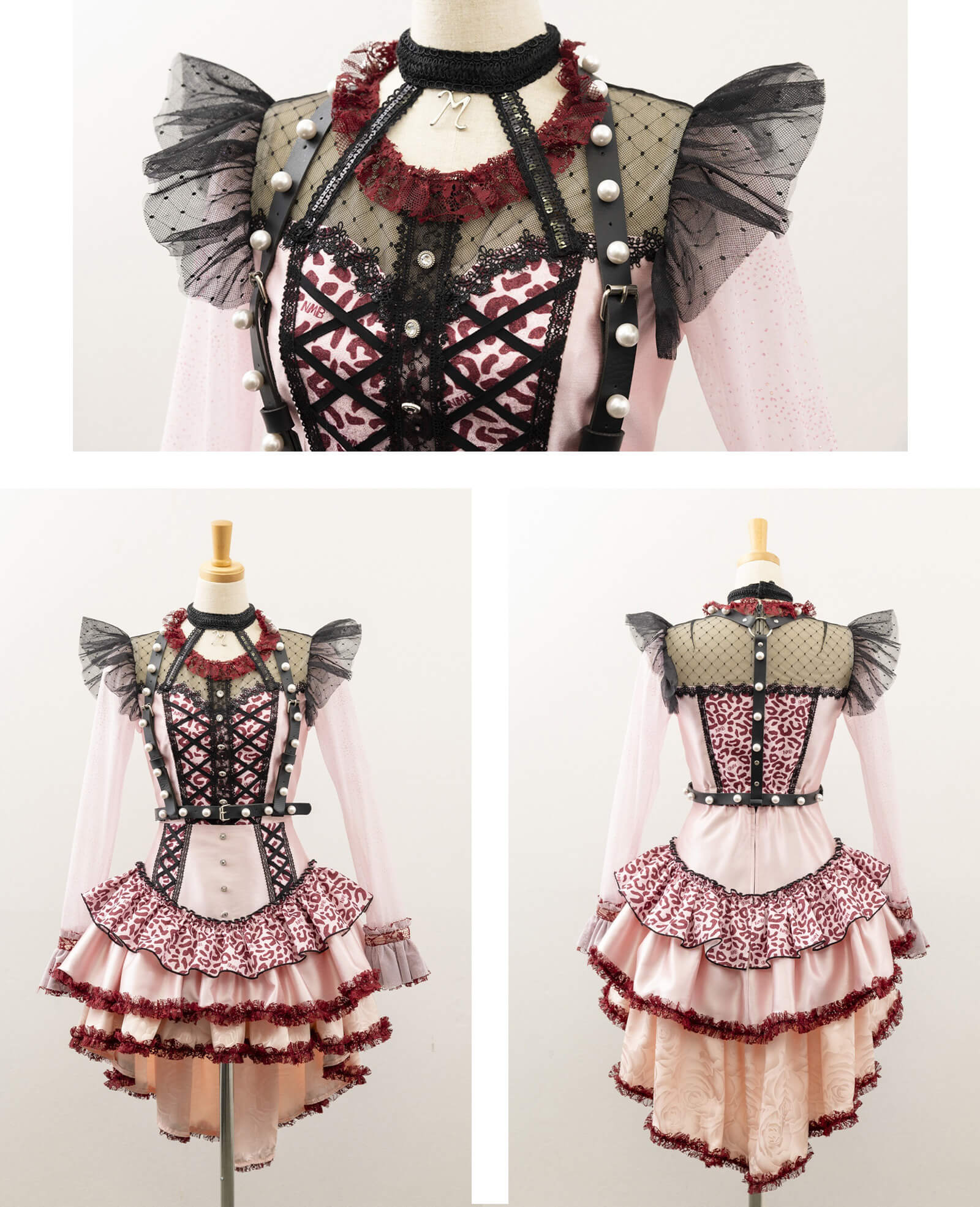 「チームMは、異性だけでなく同性の女の子たちにも支持されるような、女性らしさとガーリーさ、少しゴシックテイストを意識した衣装です。全体的にピンク色でレース、フリル、リボン、編み上げなど、女の子が『かわいい!』とテンションが上がるものをたくさん詰め込んで、締め色として黒革で装飾を。各チーム共通のヒョウ柄はチームカラーのピンク色。スカートの裏地には上品なバラ柄の生地を使って、細かいところまでこだわりました。着用時は、スカートがふわっと膨らむようにパニエを着用。あと、薄手のニーハイソックス!かわいいのですが、ダンスが激しいから破れやすいし、早替えも大変なんです。製作途中でいろいろ試したのですが、『膝下や透け感があまりないニーハイタイツだとかわいさが半減しちゃう』という話になって、あまり耐久性がないとわかっていたのですが、メンバーも大切に扱います!と言ってくれて、最終ニーハイソックスを選びました。首元のチョーカーには、チームMを象徴した“M”のチャームが付いています。
