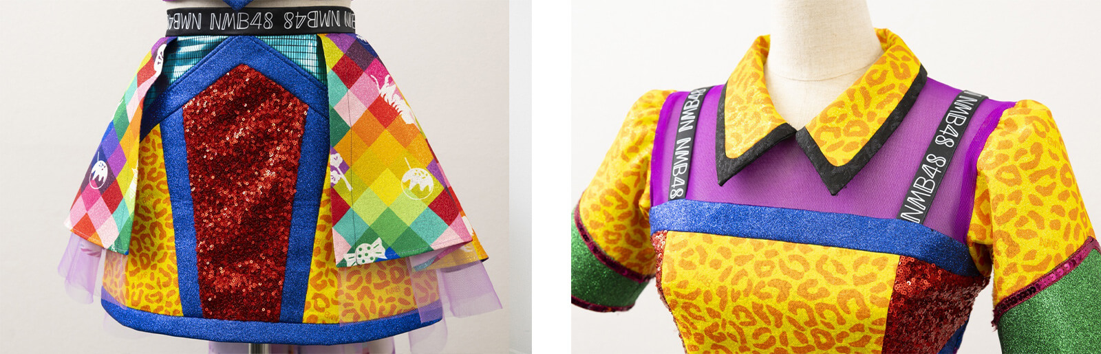 トップスは、メッシュ部分がピンクとパープルの2種類、ボトムスは、チュールがブルーとパープルの2種類。こじりん(小嶋花梨)が着ている衣装はタイトスカートのタイプでクールなイメージ、ちっひー(川上千尋)が着ている衣装はパフスリーブにひらひらしたスカートでキュートな雰囲気に。アクセサリーにもヒョウのモチーフ。赤と青をポイントに、“NMBらしい華やかさ”をブラッシュアップさせた衣装を目指しました」