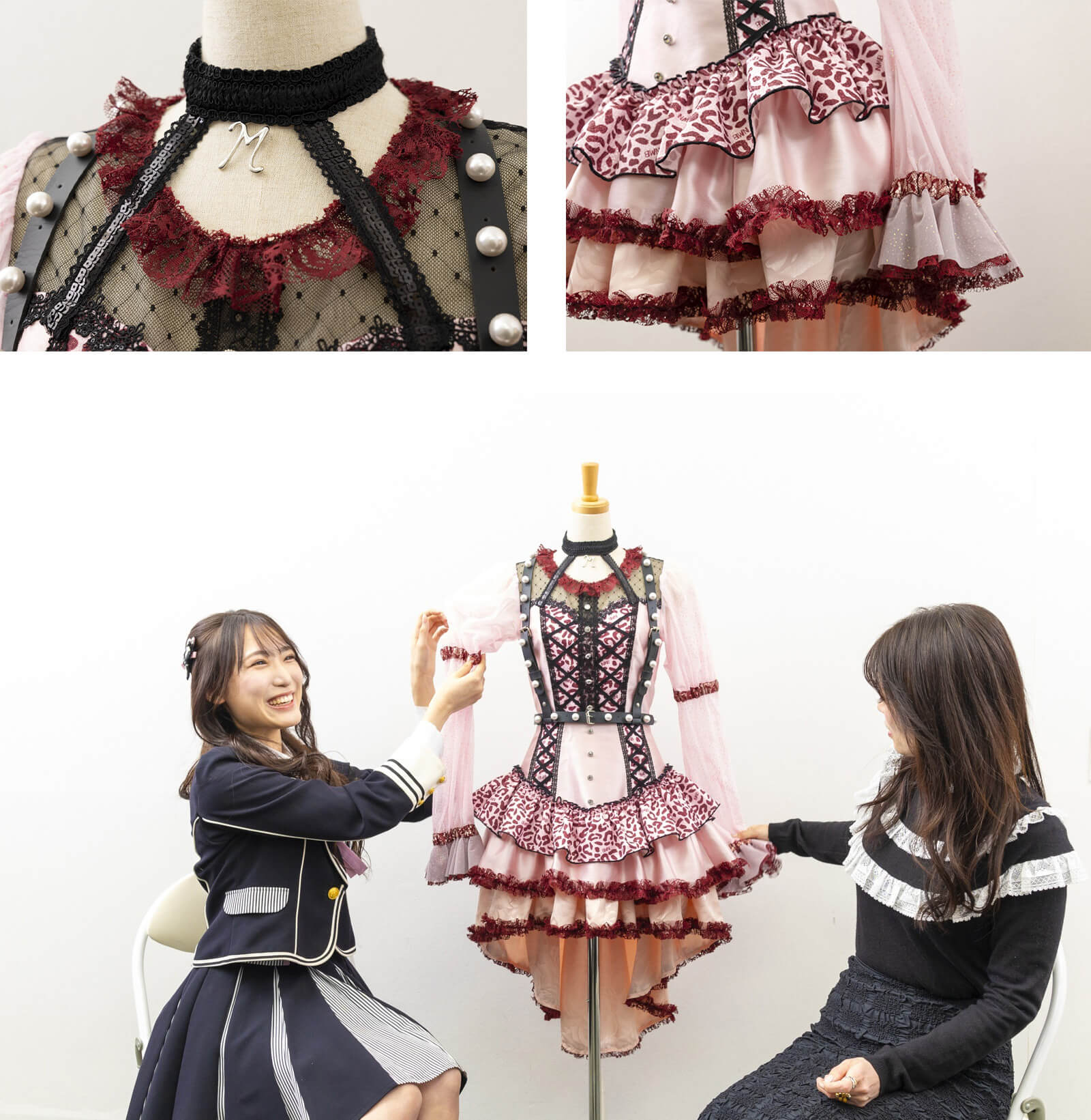 原「れいこさんとお話ししていたときに、れいこさんと私のお衣装のイメージが合致して意気投合しました。今までのチームMのイメージには『おもしろい』も『かわいい』もあって、チームカラーであるピンクを使うこともたくさんありましたね。今回のお衣装では、女の子が『かわいい』と思うレースやフリルをたくさん使ってほしいとお願いしました」
