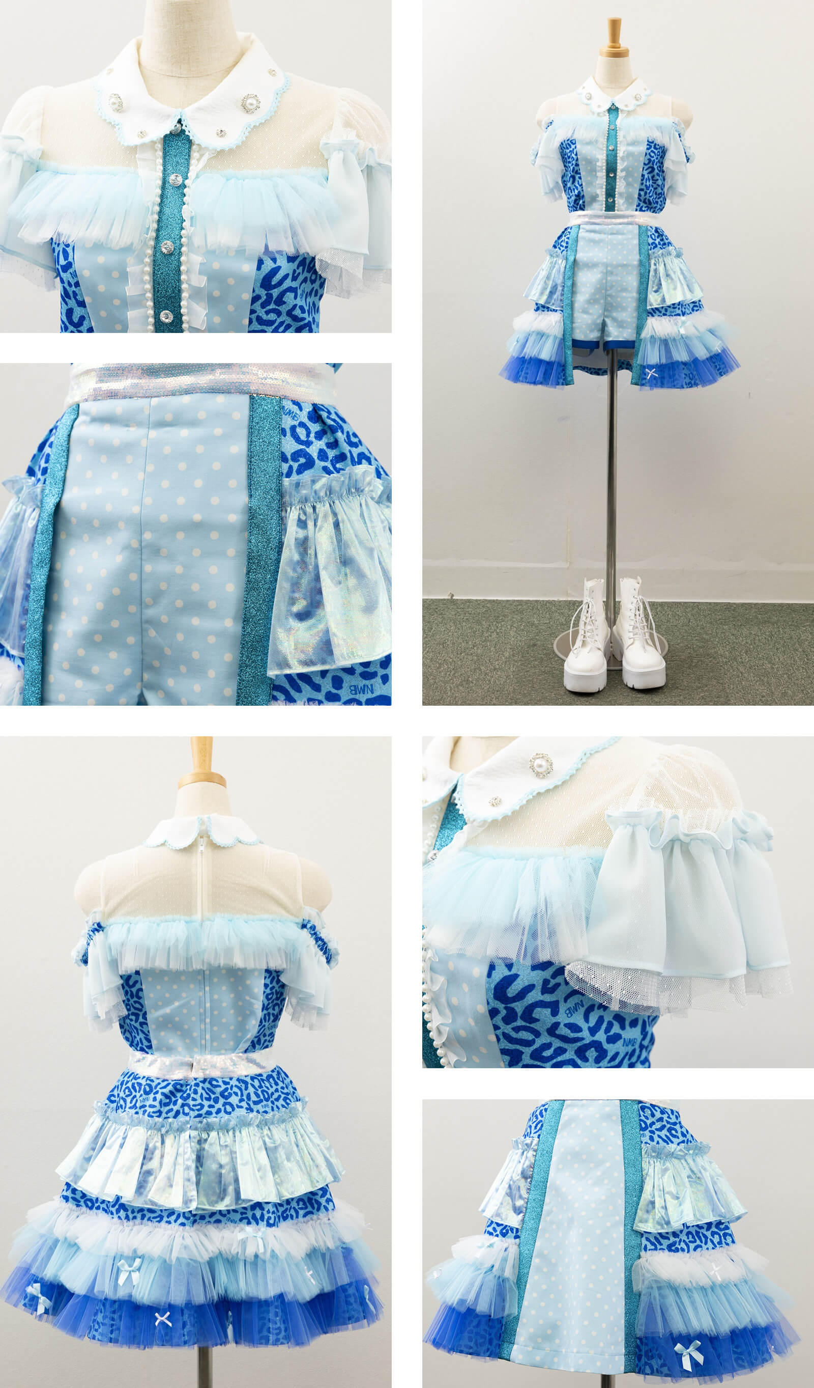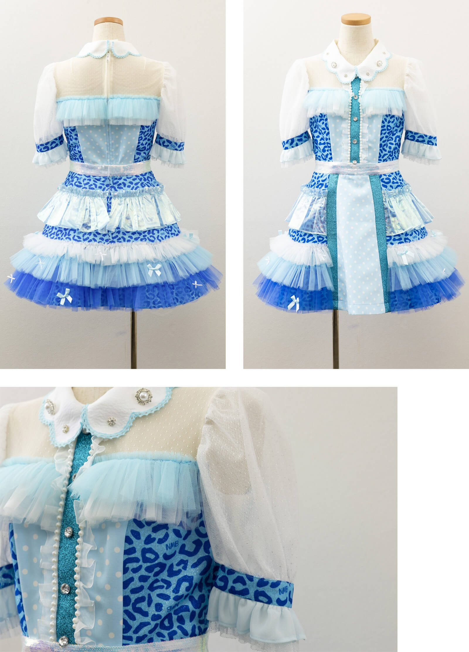 「チームBⅡは若手のメンバーも多いですし、フレッシュなアイドルど真ん中を目指した衣装になっています。全体的に青や水色を使い、ヒョウ柄もチームカラーのブルー。フレッシュ感を出すためにドット柄を使っているんですが、これ、実はカルピスウォーターやポカリスウェットをイメージしているんです(笑)。これは、キャプテンのゆいな(出口結菜)からのリクエストです。また、フレッシュさだけではなく、ちゃんとアイドルらしさも組み込みたくて、フリルを使ったり、裾のチュール部分に小さなリボンを散りばめたりしています。若手が多いチームだからこそ、身長が伸びたりしても大丈夫なように、成長にも対応できるような仕様にしています。